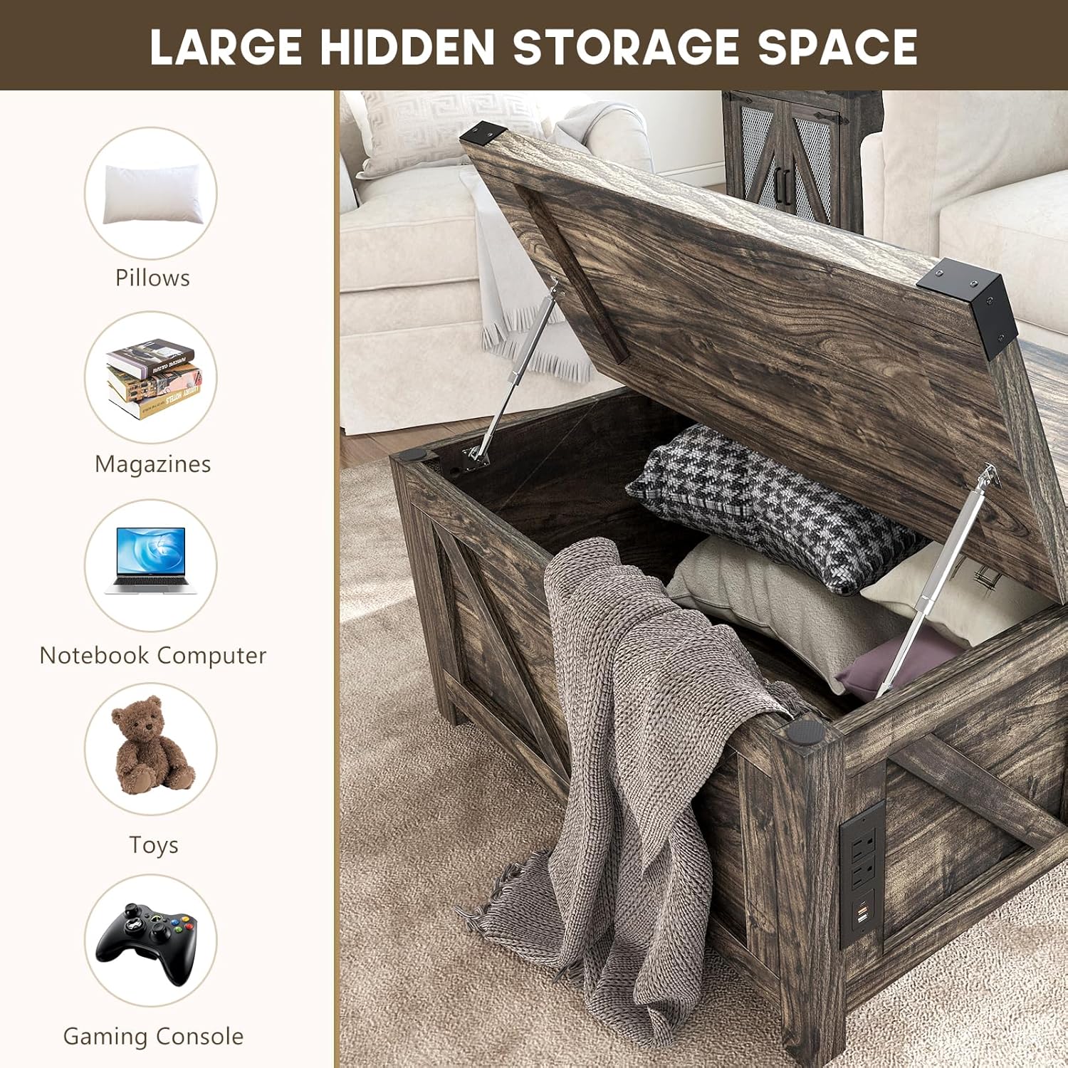 Farmhouse Lift Top Coffee Table with Storage, Wood Square Center Table with Charging Station&USB Port, Living Room Table w/Large Hidden Space, for Living Room, Bedroom, Home Office, Dark Grey