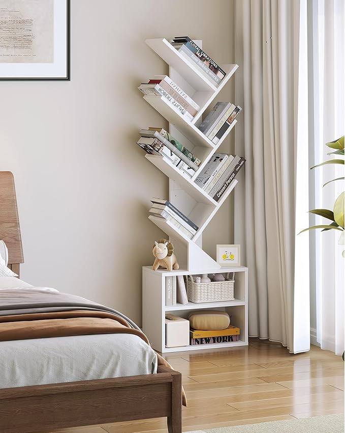 - Small Bookshelf for Small Spaces: Featuring a compact design, the floor standing tree bookshelf optimizes floor space, making it an excellent choice for bedrooms, home offices, corners, hallways, or smaller living rooms. This narrow small bookcase organizer provides ample storage for books, CDs, game cassettes, decorations, and more. Keep your belongings stylishly organized, ensuring a neat and clutter-free space. ( Book shelf dimensions: 47.4"H*14.6"L*"7.9"W )